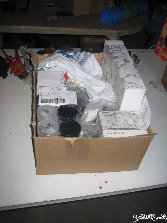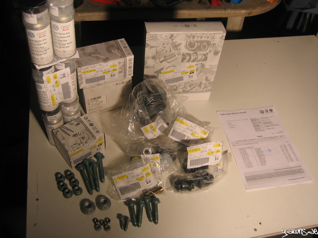 Im Paket sind Motorlager, diverse Lager der Vorderachse, neue Schrauben vorne, neue Muttern für die Antriebswellen, ein Ölfilter, ein Spritfilter, Kleinscheiss und 3 Sätze Wagenfarbe/Klarlack für die Stellen, an denen wir arbeiten mussten.