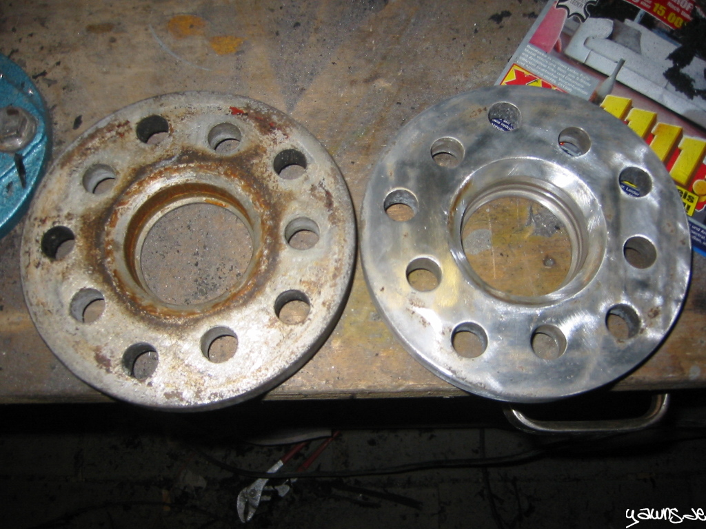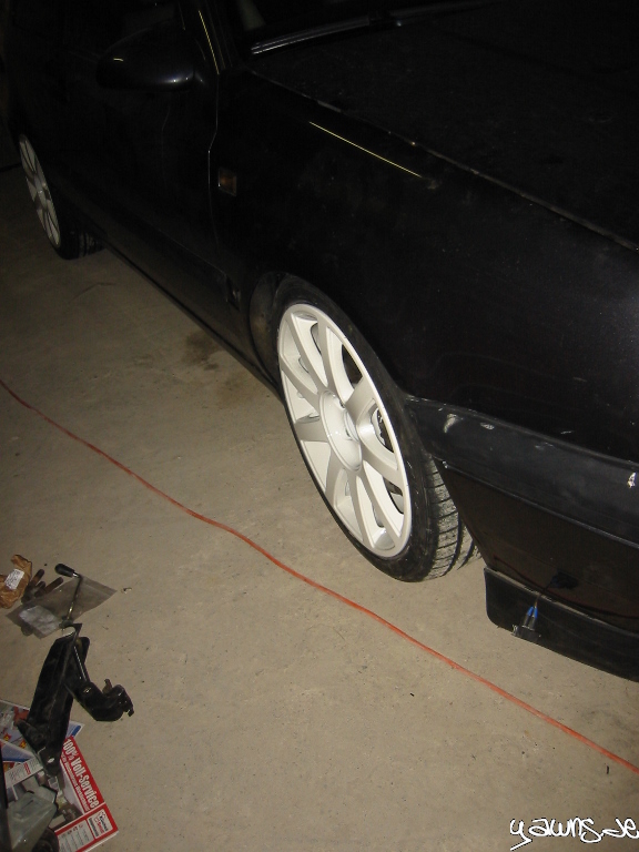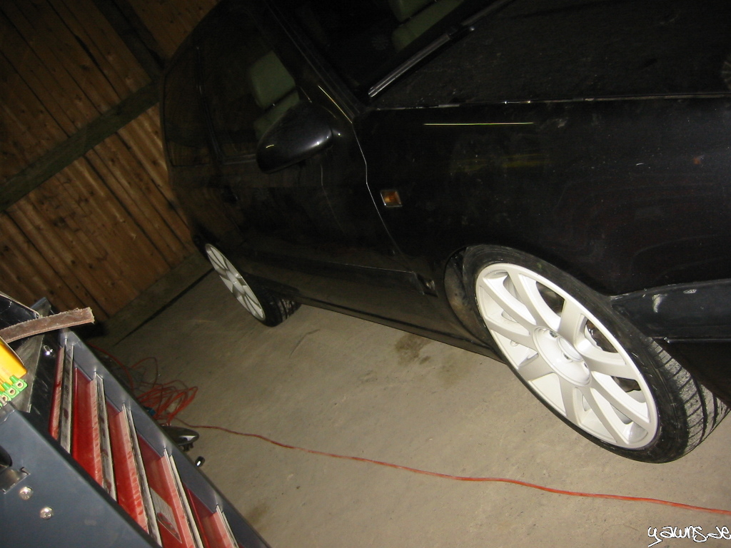 Gestern haben wir den rechten Kotflügel gebördelt, das Fahrwerk runter gedreht, den Kotflügel versiegelt, die Felge drauf gesteckt und die Höhe für gut befunden. Viel tiefer geht nicht, weil ich dann nicht mehr in die Halle komme .. ich will aber auch gar nicht tiefer.