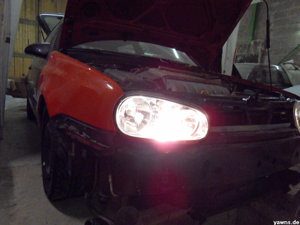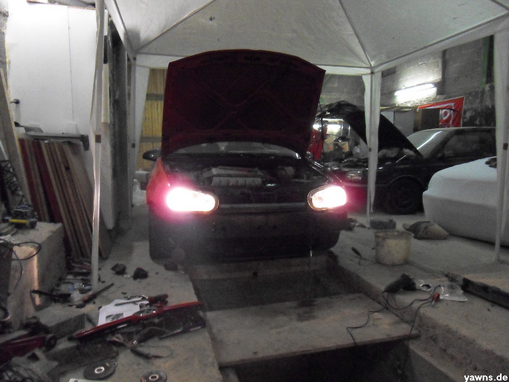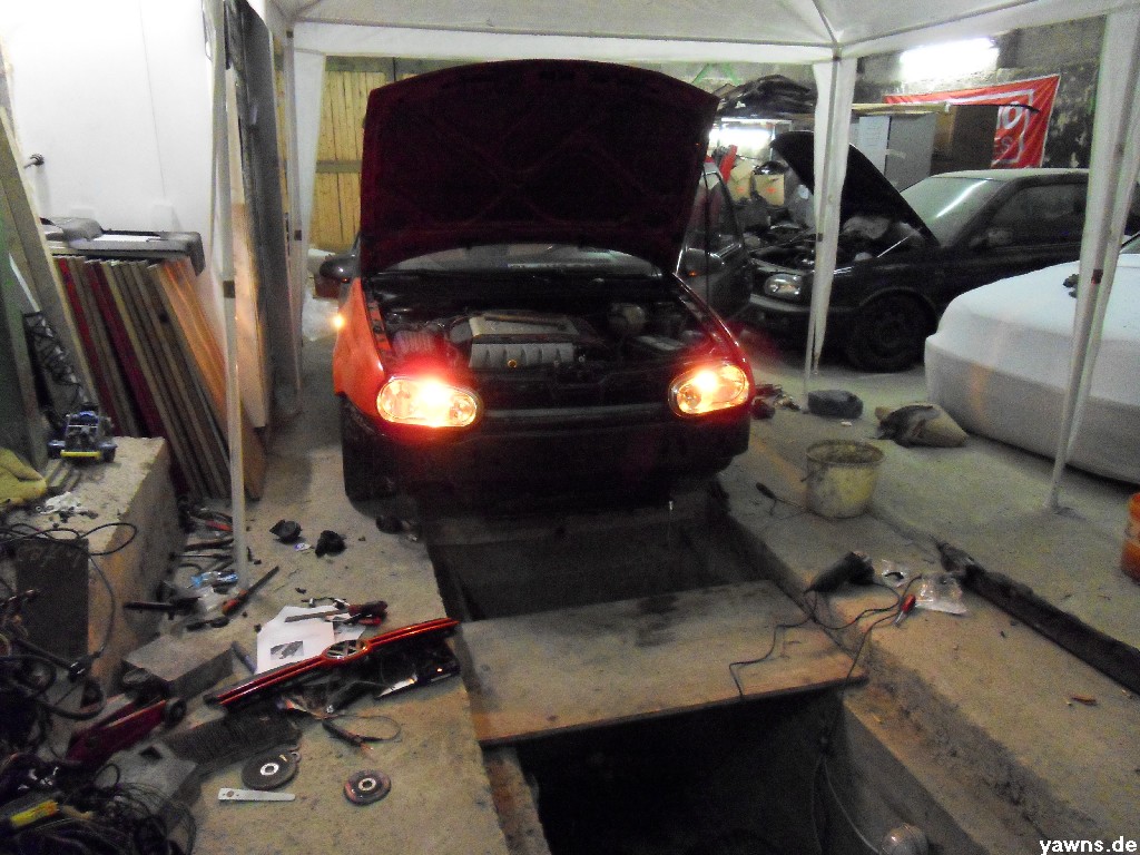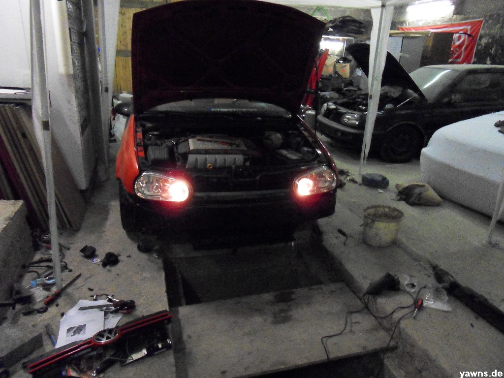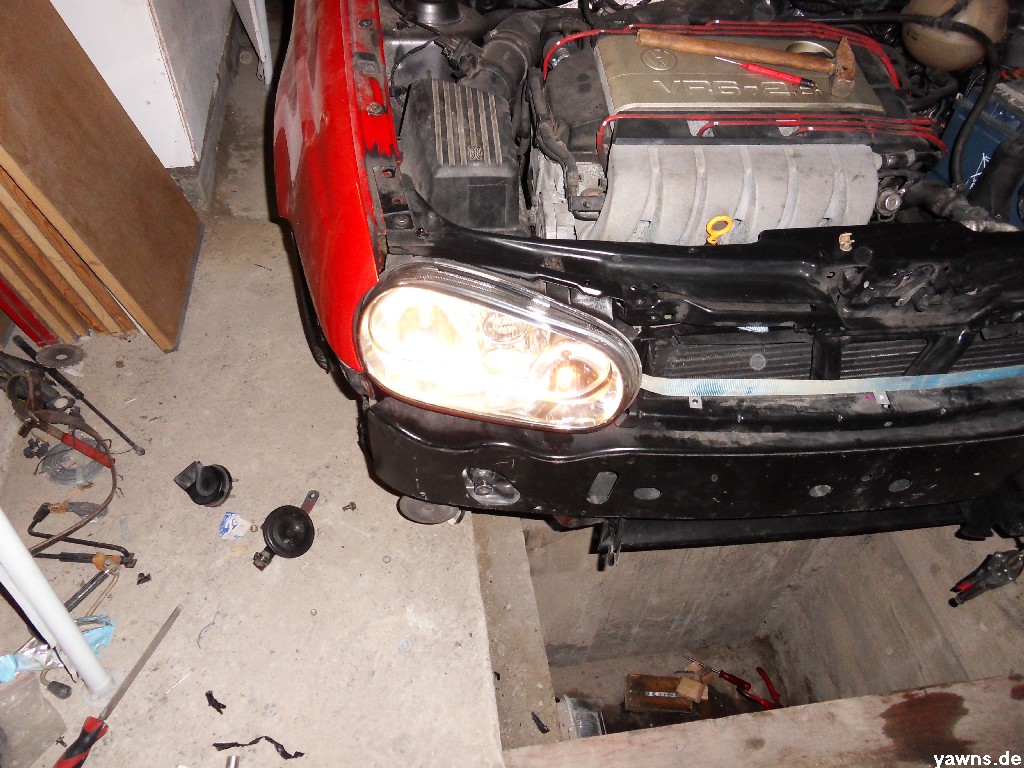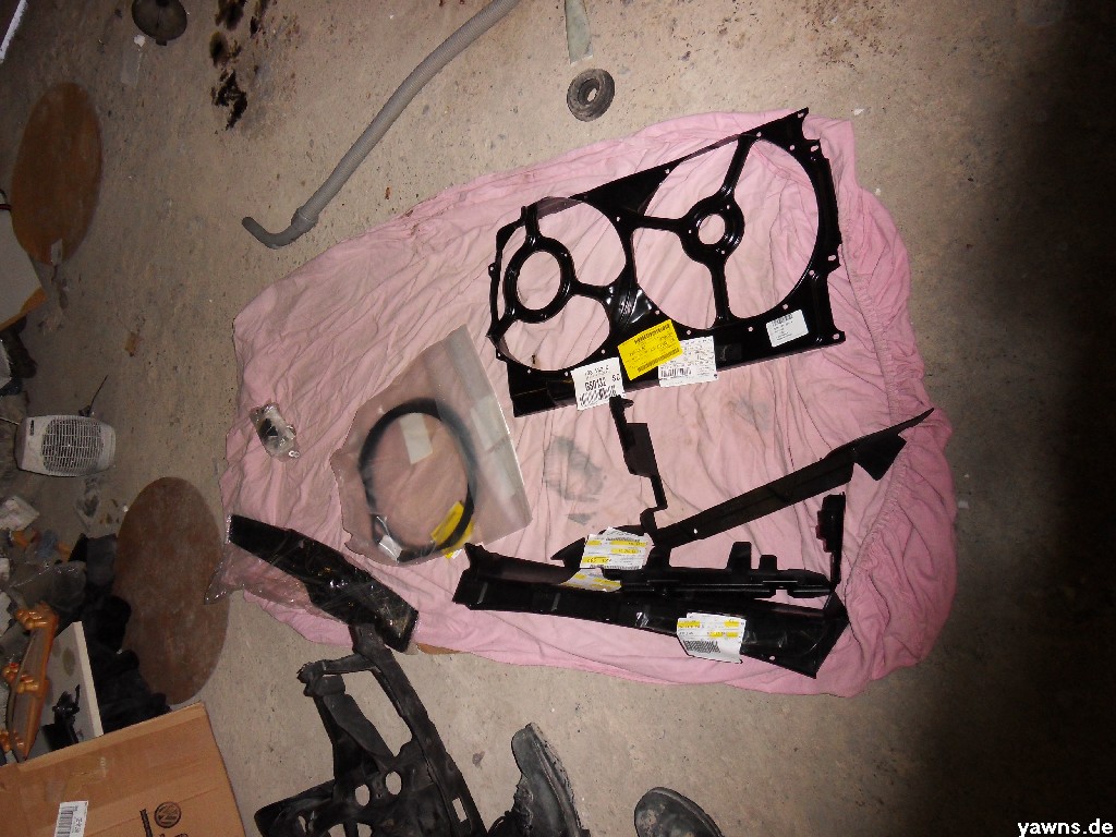 Voller Tatendrang hab ich die Kartons ausgepackt, die ich von Haiko bekommen habe, hab die Lüfter aus dem alten Schloßträger geholt (dabei abgerutscht und einmal den Daumen durch den Träger gedrückt), hab den neuen Wasserkühler ausgepackt, den Klimakühler drauf geschraubt und war dann leicht irritiert … die Wasseranschlüssen am Cabriokühler sind auf der Beifahrerseite. Selbst mit neuen Schläuchen würde ich NIE am VR vorbei kommen, um die Anschlüsse zu verwenden. Also muss doch der alte Kühler herhalten, und es muss eine alternative Methode gefunden werden, den Kühler/Lüfter-Teil mit dem Schlossträger zu verbinden. Derzeit ist das ein einfacher Spanngurt 😉 So konnte ich wenigstens gucken, ob Platztechnisch alles hinhaut … und das tut es. Knapp, aber geht. Da ich am Schlossträger nicht weiter machen konnte, hab ich mich der Elektrik gewidmet. Die Kabelstränge Blinker+Nebler+LWR+Scheinwerfer laufen beim Cabrio in einem Stecker zusammen, also hab ich alles ausgepinnt und in die neuen Steckergehäuse gefriemelt. Die Kabelstränge werd ich noch zusammenfassen und neu umwickeln, aber es funktioniert 🙂 Jetzt brauch ich zwar noch nen neuen Lichtschalter (mein Cabrioschalter hat keine NSW, hab derzeit einen ausm Vento angesteckt), aber nun gut ..