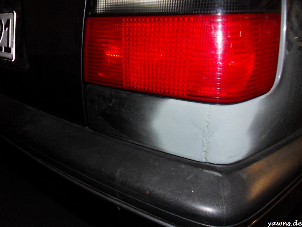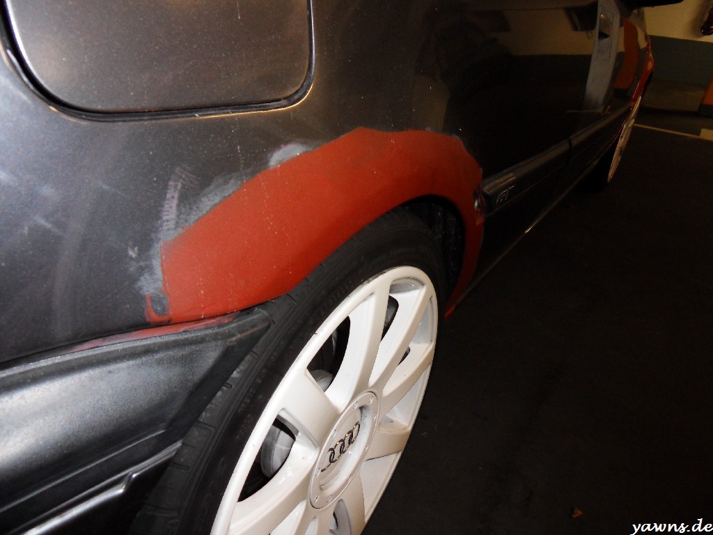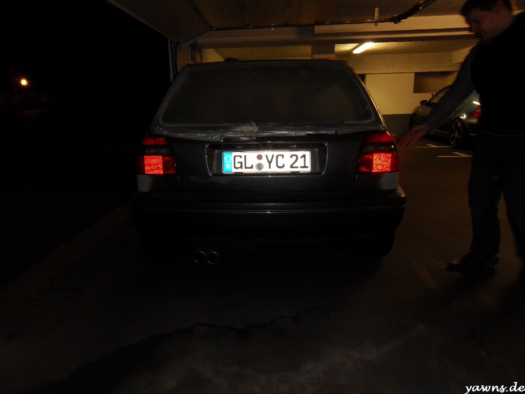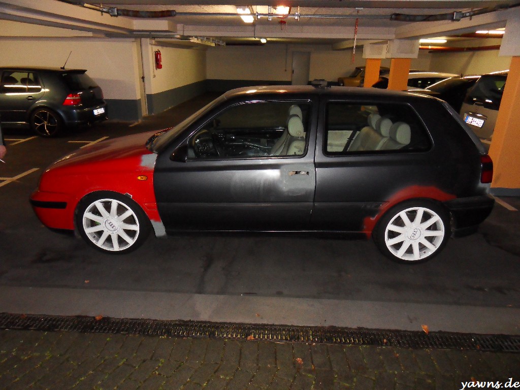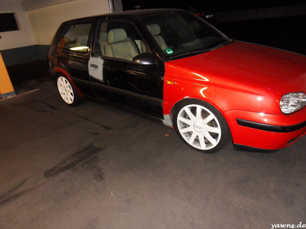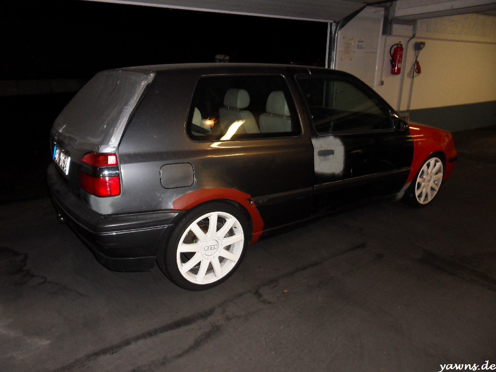 So, nach einem langen Arbeitstag gestern und Hallenaufenthalt waren Tim und ich heute früh um 3 oder so noch schnell beim Golf, Bilder für den Lackierer machen. Nachdem wir dann bei Stella das Federbein vorne links getauscht haben, hat sich der Lackierer die Bilder aufm Notebook angeguckt und mal grob 2000-2500€ und knappe 3 Monate in den Raum geworfen. Ist zwar einiges, aber die Arbeiten bei Stella sehen sehr gut aus.