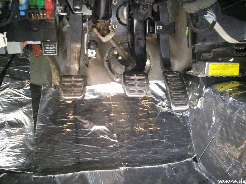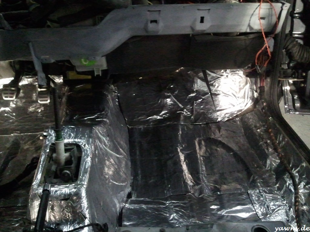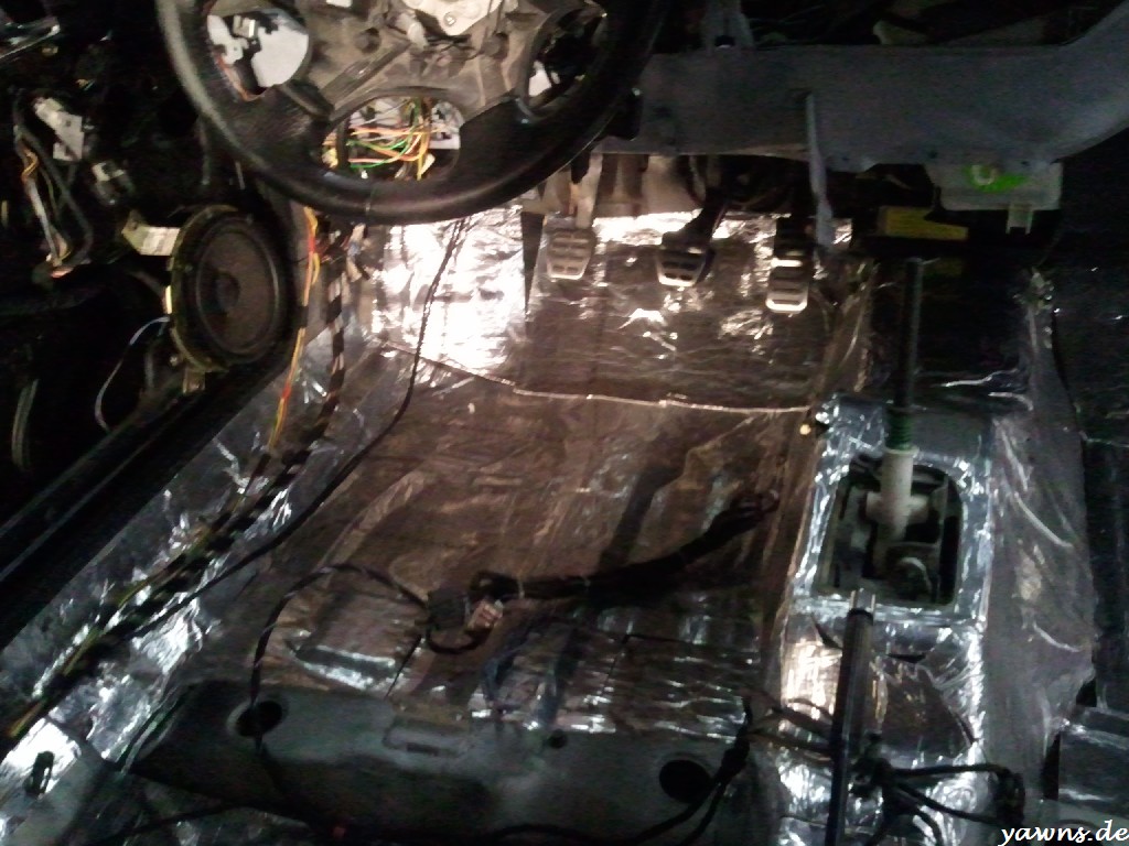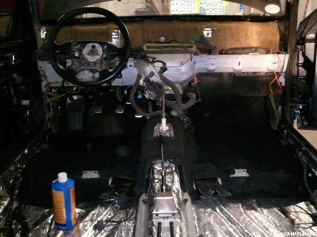Airbagkabelbaum ordentlich umwickelt, Kabel verlegt, Auto ausgesaut, gedämmt und Matten und Teppiche wieder reingelegt. Das Airbagsteuergerät sitzt da, als wenn es schon immer im Auto gewesen wäre und mein Teppich und die Dämmmatte hatten auch schon die passende Aussparung. Was natürlich elendig aufhält ist das Putzen der ganzen Bauteile, aber staubig wollte ich die nicht wieder einbauen. Nächstes Wochenende muss ich mich dem Thema Rückbankhalterung widmen, danach kann dann auch der hintere Teppich rein.