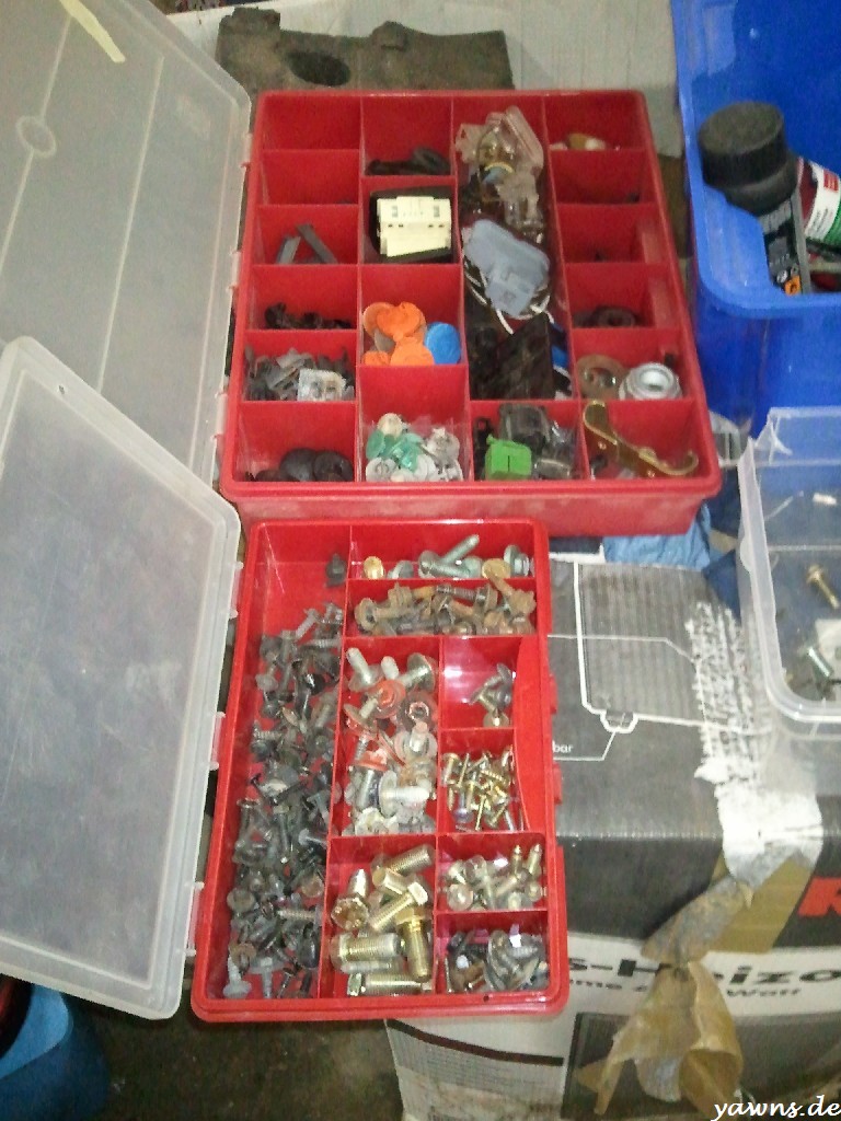Während der Lack trocknen konnte, habe ich die ganzen Schrauben und Clipse aus der großen Box sortiert … was für eine Kackarbeit 😀