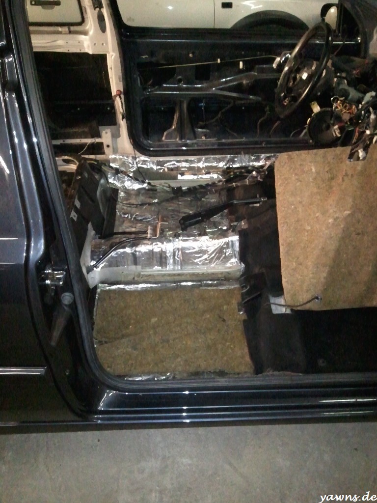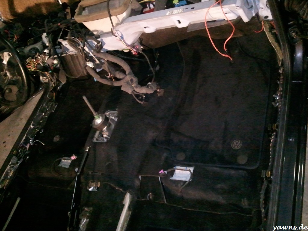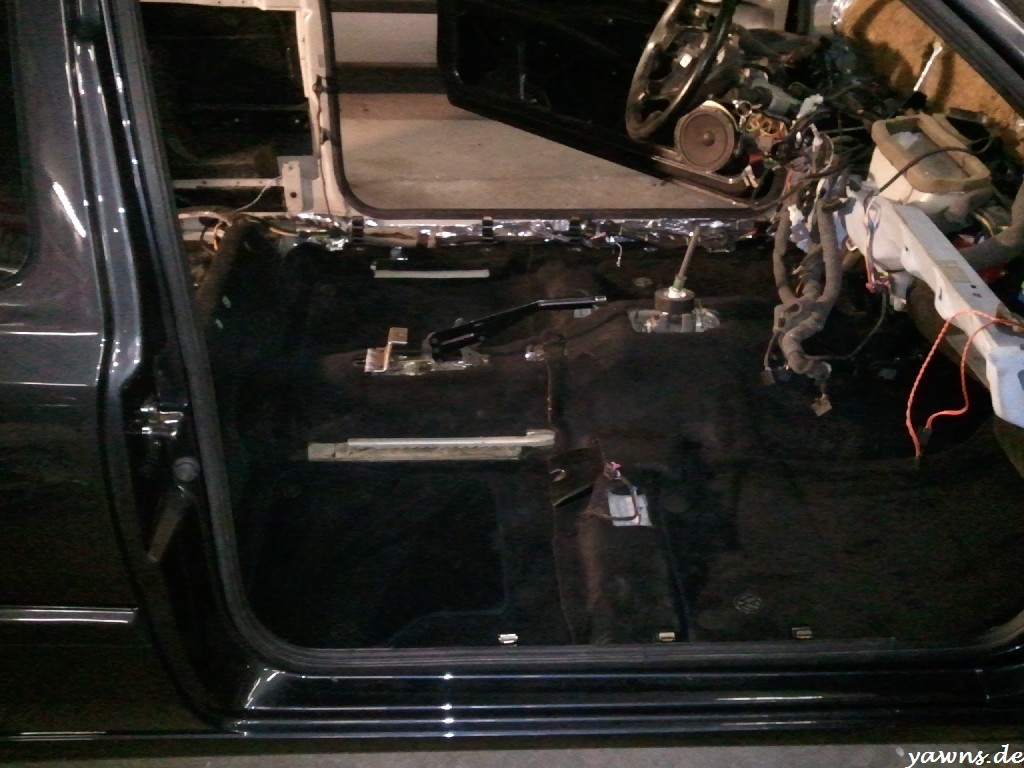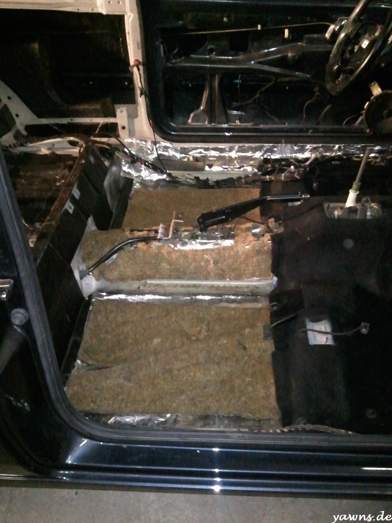 Bevor die Teppiche rein durften, wurden auch diese komplett ausgeklopft und gesaugt, soll ja ordentlich werden. Dazu gabs die ganzen neuen Halter, durch diei die Kabel laufen und in die später auch die Schwellerinnenverkleidung geclipst wird. Einer ist mir beim Einbau zerbrochen, da muss ich noch einen neuen ordern. Zum Testen habe ich auch mal die vordere Mittelkonsole montiert, sitzt jetzt schön fest und wackelt/klappert nicht mehr durch die Dämmung. Den Polo Schaltknauf habe ich von unten aufgebohrt, dadurch kommt er knappe 5 cm weiter runter auf der Schaltstange. Davon gibts leider keine Bilder mehr.