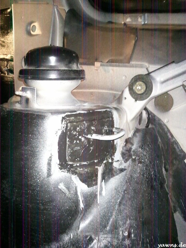 Heute gings weiter. Die geschweißten Stellen wurden blank geschliffen, mit Zinkspray geflutet (damits auch in jeden eventuellen Hohlraum läuft) und später mit Petec abgedichtet. Die versauten Matten werden natürlich durch neue ersetzt und bis an den Halter geklebt, der Halter selber bekommt Wagenfarbe. Leider hat das Handy irgendwie nen Schuss, so dass einige Bilder komplett weg sind und andere extreme Bildfehler hatten. So sind alle Bilder vom Cabrio Abschlepphaken weg, obwohl ich sie vorher auf dem Handy gesehen hatte 🙁