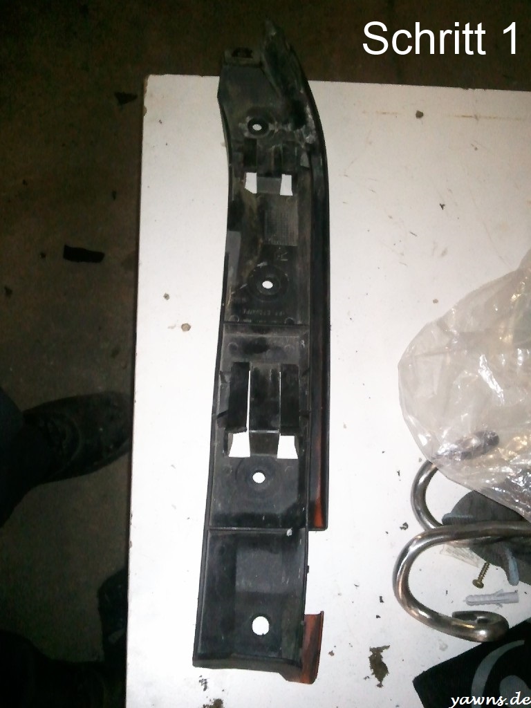 Also habe ich, weil die Front ja eh runter musste, die Halter demontiert .. zum Glück haben die keine Langlöcher, man kann sie also nicht versetzt wieder montieren und muss dann ausrichten. Ich hab leider erst, nachdem die Hälfte der Farbe schon entfernt war, ein Foto gemacht (Schritt 1). Anschließend mit Verdünnung geschrubbt (Schritt 2), im warmen Wasser mit Bürste und Pinsel geschrubbt (Schritt 3) und mit KochChemie PlastStar behandelt, weil die Verdünnung sonst das Plastik weiß verfärben würde (Schritt 4). Den Unterschied fängt die Handy Kamera leider nicht gut ein, es ist einfach satt schwarz geworden.