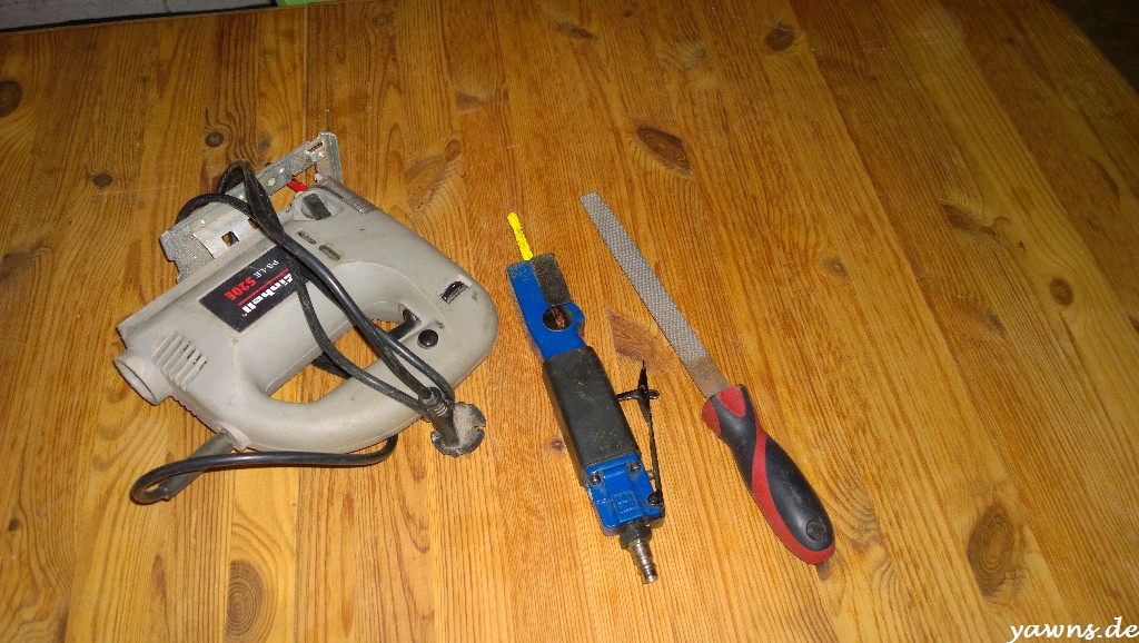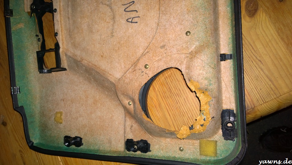 Heute ging es den Türpappen an den Kragen. Damit die Pappen über die Cabrio-Lautsprecherhalter passen, müssen sie ein bisschen angepasst werden. Zum Glück ist auf den 97er Pappen hinten sogar schon vormarkiert, wo geschnitten werden muss. Also ging es mit Stichsäge, Druckluftsäbelsäge, grober Feile und Schmirgelpapier (nicht auf dem Bild) los. Irgendwie gibt es keine Bilder von den fertigen Pappen .. keine Ahnung, wieso.