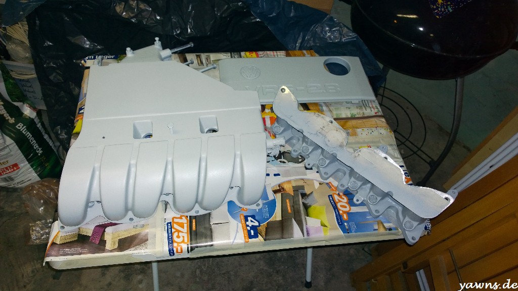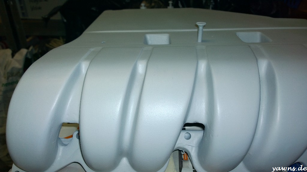 Mittlerweile sind beide Teile der Ansaugbrücke und die Motorabdeckung gereinigt, geschliffen und grundiert. Die Läufer, die an der oberen Ansaugbrücke entstanden sind, wurden rausgeschliffen und korrigiert.