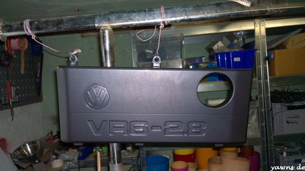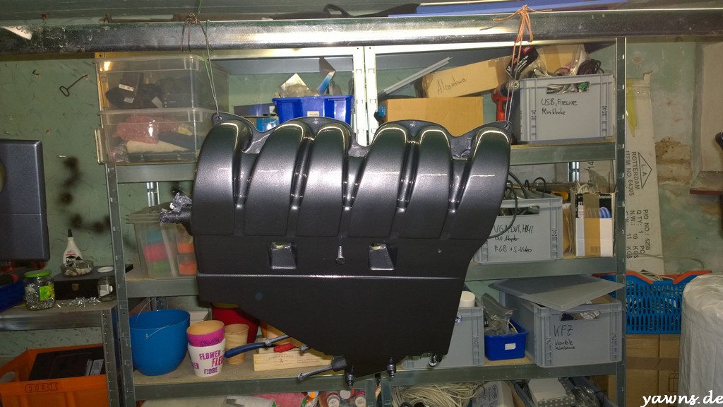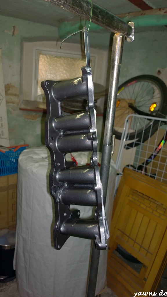 Heute hatte ich tatsächlich mal die Zeit, die Motorteile aufzuhängen, zu entfetten und Klarlack aufzutragen. Insgesamt sind 3 Schichten Klarlack auf den Teilen und dafür, dass das meine ersten Lackierversuche sind, bin ich echt zufrieden. Die Teile sind beim drüberstreichen schon angenehm glatt, allerdings erkenne ich – je nach Lichteinfall – ein wenig Orangenhaut. In ein paar Tagen, wenn alles richtig durchgetrocknet ist, werde ich mal an einer unauffälligen Stelle polieren und schauen, ob sich da noch was ändert.