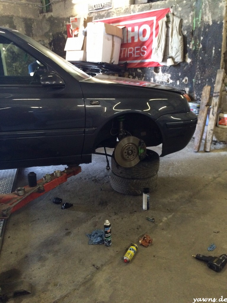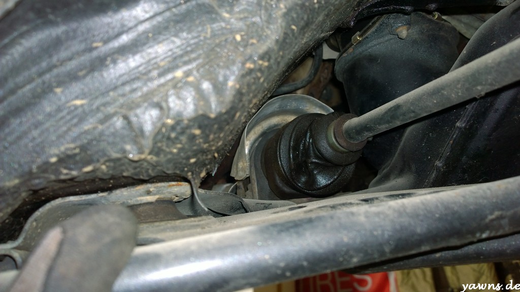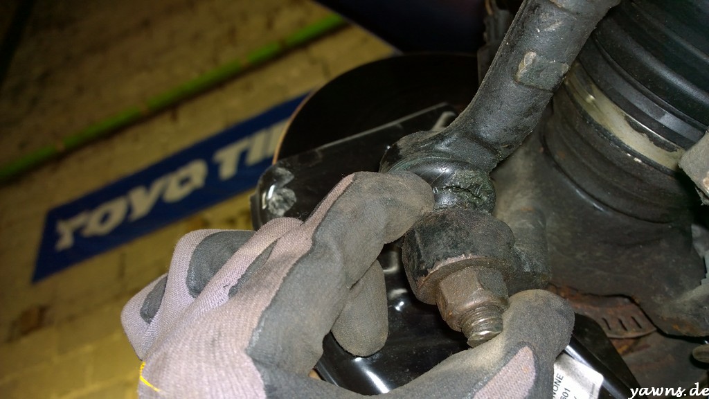 Die Koppelstangen bzw deren Lager haben auch schon darunter gelitten, also bekommen die Querlenker jetzt R32 Lager und die Koppelstangen kommen gleich mit neu. Die beiden Spurstangenköpfe sind problemlos runter gegangen. Fahrerseitig ist schon der neue drauf, Beifahrerseitig muss natürlich erst die Manschette gemacht werden. Hoffentlich ist – wenn die Köpfe getauscht und die Lager neu gemacht sind, auch das komische Knacken beim Anfahren endlich weg. Die Manschette der Spurstange rechts ist eingerissen, kommt also auch noch neu …